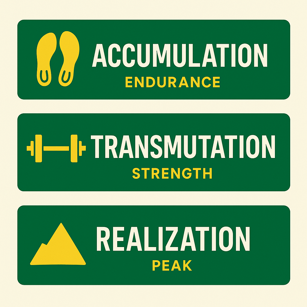 • Transmutation Block: Moderate volume/intensity, focusing on sport-specific skills and strength.